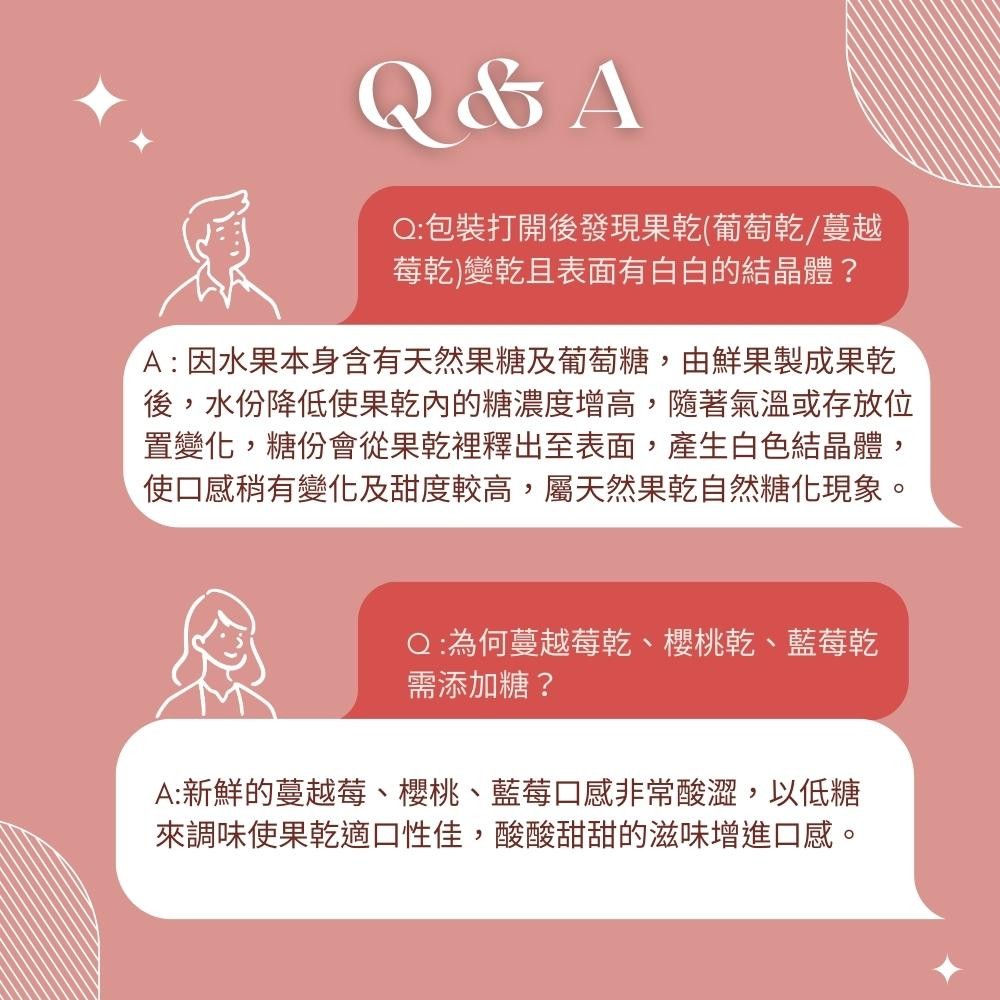 ●低糖浸漬增加果乾的口感,酸甜順口、不甜膩;果肉超大,香Q獨特,天然營養又好吃。