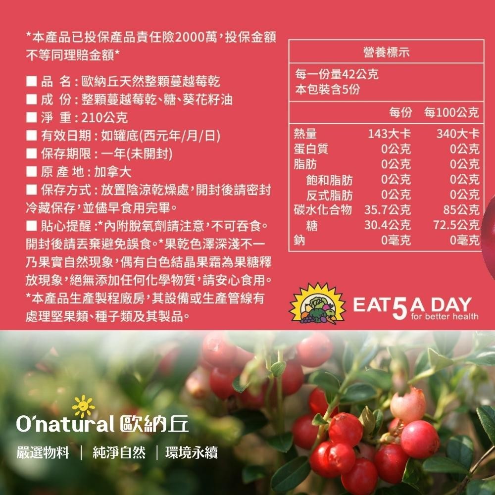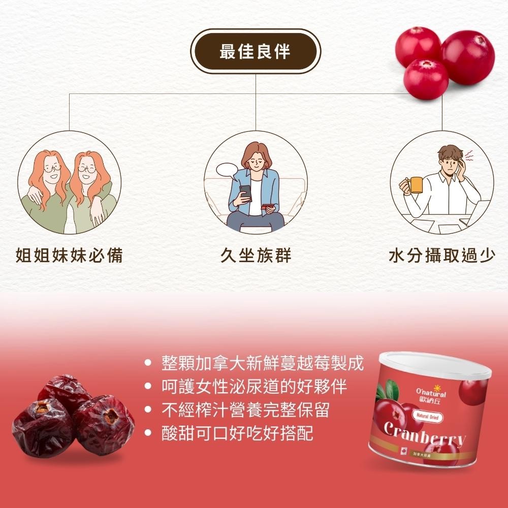 蔓越莓是全世界稀有的水果,營養和水分都非常高的水果,有「紅寶石」之稱,我們以加拿大整顆新鮮蔓越莓製成果乾,不像大部分的蔓越莓乾以壓出蔓越莓汁後才製成果乾,歐納丘的天然整顆蔓越莓乾不以蔓越莓汁為主要產品,因此蔓越莓乾原果香氣十足,營養價值極高,又可養顏美容。