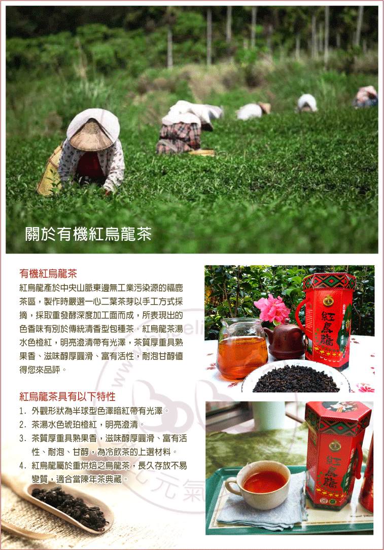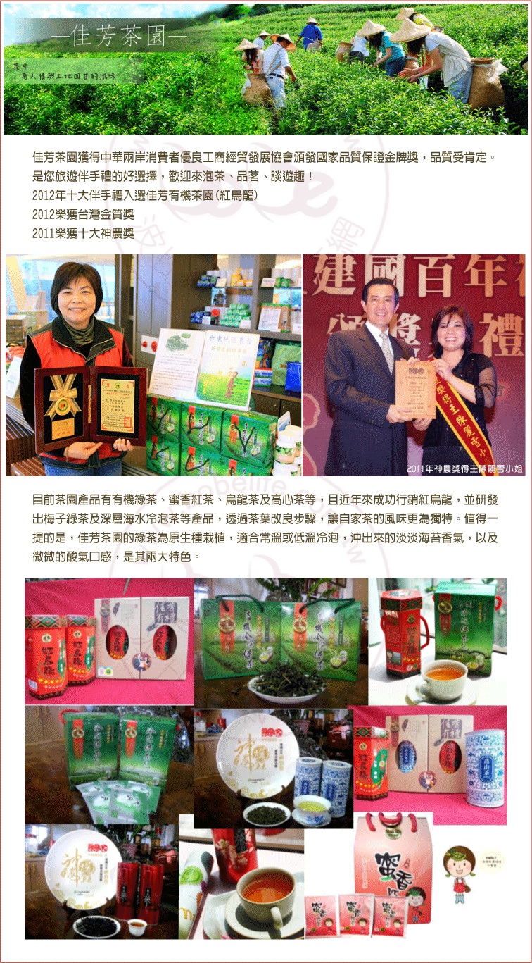 佳芳有機茶園所生產的紅烏龍主要特色是台灣本土茶青心大冇製作而成,必須以手工方式採摘,嚴選一心二葉茶芽,採取重萎凋、重攪拌結合部分紅茶製法深度加工而成,所表現出的色香味有別於傳統清香型包種茶。采園國際有機認證:EG-13602FIZ