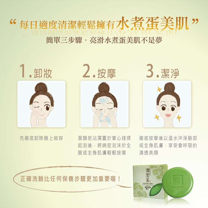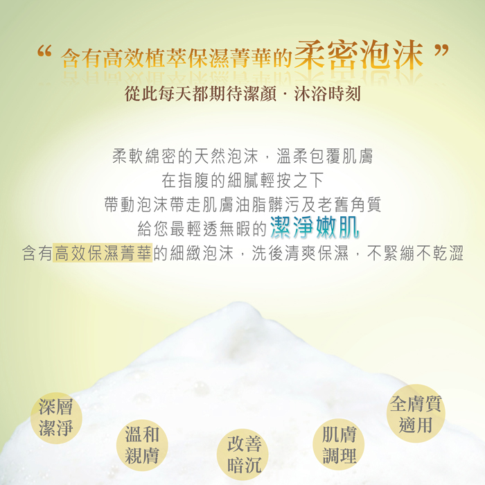 柔細綿密的天然泡沫中,富含茶籽 & 綠豆天然成份及綠茶多酚植萃菁華,